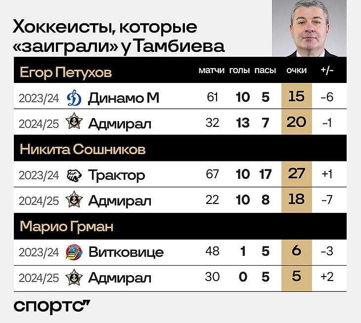 ● Кто точно не жалеет, что остался в «Адмирале», так это Даниил Гутик. В сезоне-2022/23 ему был 21 год и Тамбиев только подводил его ко взрослому уровню. Уже в следующем сезоне нападающий стал лидером команды – единственный провел все 68 матчей и стал одним из лучших бомбардиров с 36 (12+24) очками. В этой регулярке он остается лидером клуба – у форварда уже 21 (6+15) очко, он лучший бомбардир и ассистент команды. Лишь немного отстает Павел Шэн, который за три месяца набрал 19 очков – уже больше, чем за весь прошлый сезон.