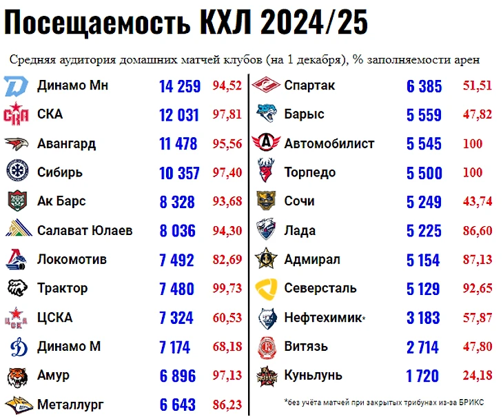 посещаемость КХЛ сильнее всех на дно тянут Нефтехимик с Витязем из относительно малых городов и особенно номинально китайский Куньлунь, базирующийся в подмосковных Мытищах (без Куньлуня средняя по сезону составляла бы уже 7 173, а без Нефтехимика и Витязя – 7 582)
