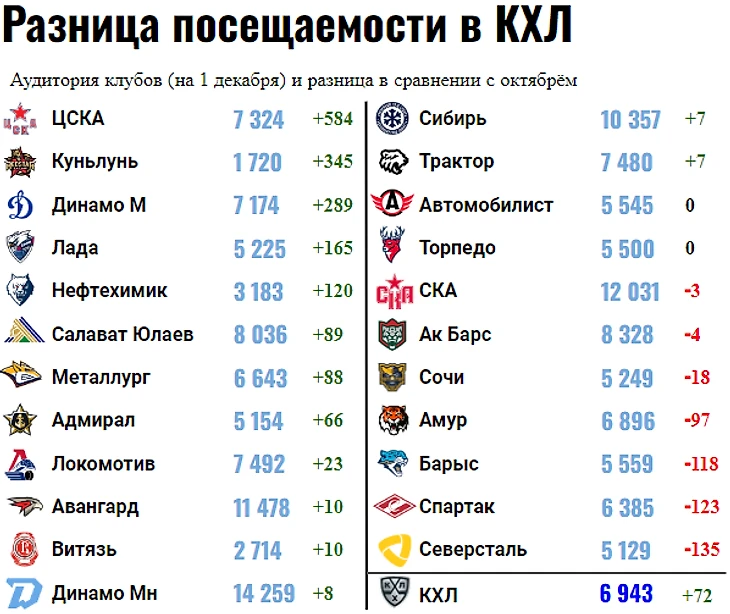 Вообще в первую очередь бросается в глаза, что в ноябре неожиданно проснулся интерес к хоккею в столичном регионе. Первые 3 места по приросту аудитории занимают ЦСКА, «Куньлунь» и московское «Динамо». Насчет китайского клуба правда стоит уточнить одну важную деталь – подавляющее количество игр в Мытищах все так же проходит при пустых трибунах, а ноябрьский прирост объясняется одним единственным матчем со Спартаком, где аншлаг обеспечили скорее болельщики «красно-белых», чем преданные фанаты «драконов».