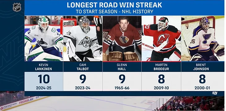 Победа над «Детройтом» получилась знаковой сразу в нескольких отношениях. Успешное турне – лишь один из факторов. Защитив ворота команды в этом матче, Кевин Ланкинен выиграл свой десятый подряд выездной матч на старте сезона. И это новый рекорд. Финн превзошел достижение древних времен Гленна Холла и прошлогодний спурт Кэма Тэлбота на старте чемпионата в джерси «ЛА». Забавно, что Тэлбот наблюдал за падением своего рекорда со льда из противоположных ворот, пусть и не весь матч из-за повреждения.