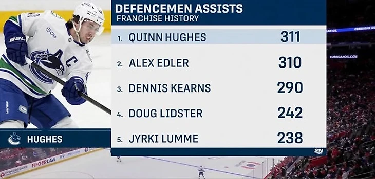 Но сейчас о внутренних рекордах. В игре с «Баффало» Хьюз сравнялся с Алексом Эдлером на вершине списка лучших защитников-ассистентов в истории франшизы, а против «Детройта» вышел на единоличное первое место (и потом сделал еще два ассиста).