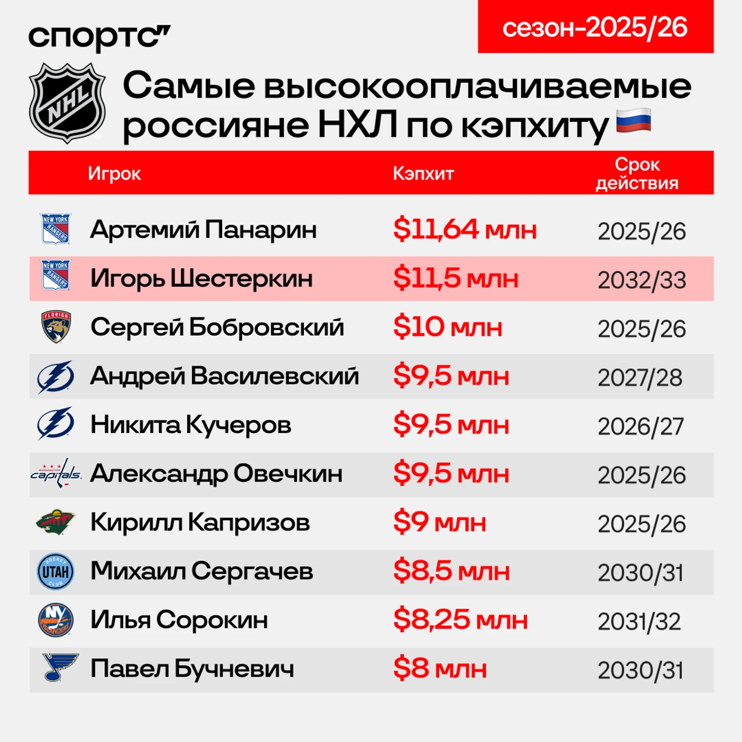 Новый контракт вывел Шестеркина на второе место среди самых высокооплачиваемых россиян. Игорь уступает только одноклубнику –Артемию Панарину. Примечательно, что в русском топ-5 сразу трое вратарей.