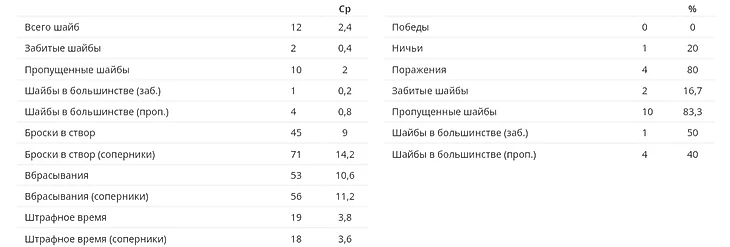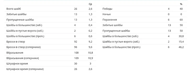 Заброшенные шайбы за игру: 2,4. Пропущенные шайбы за игру: 4. Реализация большинства: высокая эффективность. Штрафное время: 9 минут за игру.