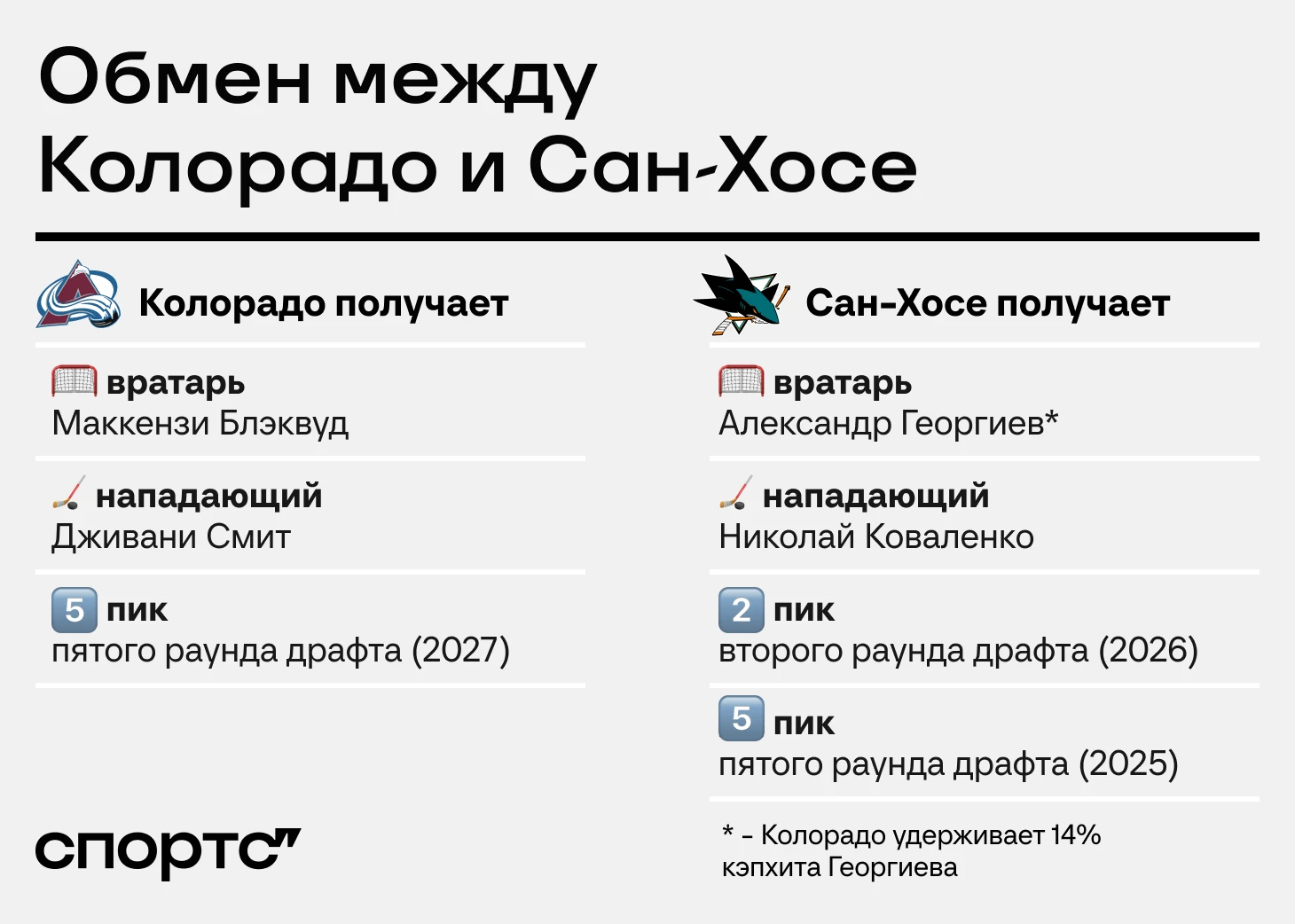 Сделка большая – в ней задействованы несколько игроков и драфт-пиков. Но главное в ней легко выделяется: Александр Георгиев отправился в «Сан-Хосе», а на замену ему взяли канадского вратаря Маккензи Блэквуда.