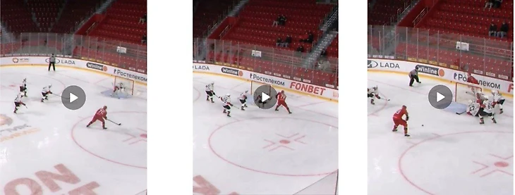 На первом скриншоте видно, как трое игроков «Кузнецких Медведей» катятся на одного игрока в красной форме, совершенно забывая про остальных. Естественно соперник наказал.