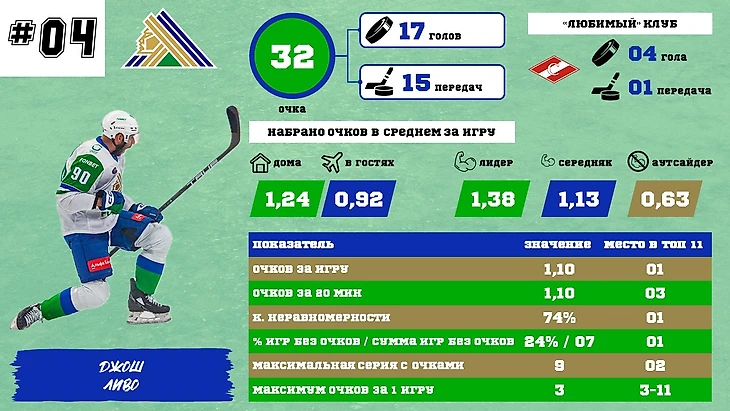 Джош Ливо – на текущий момент, безусловный лидер по большинству показателей: первый по количеству очков за игру, коэффициенту неравномерности, проценту «холостых» игр. Он пропустил несколько игр, но отстает от первого места всего на 2 очка. Также его плюс в том, что основную долю очков он набирает с лидерами – то есть потенциально еще может улучшить результаты за счет улучшения игры против аутсайдеров. В итоге, Джош является основным претендентом на первое место в этом сезоне.