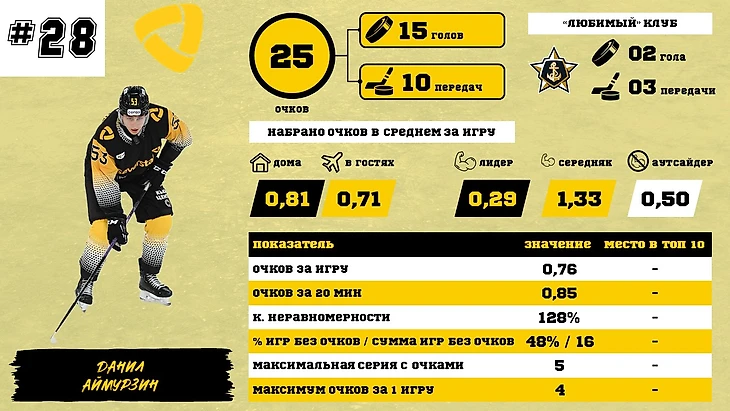 Собственно, начнем, и посмотрим (вне зачета) на статистику Аймурзина: он хорошо начал сезон (хотя и достаточно неровно) – первые 20 игр держался в темпе 1 очко за игру, но затем и у него, и у всей команды наступил спад (если не сказать кризис). В последних играх ситуация начала выправляться, но лидеров догнать уже сложно. Тем не менее надеемся, что пауза и игра за сборную пойдет на пользу.