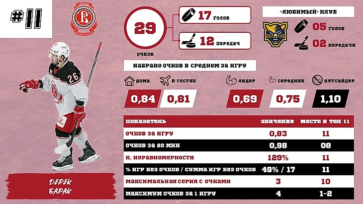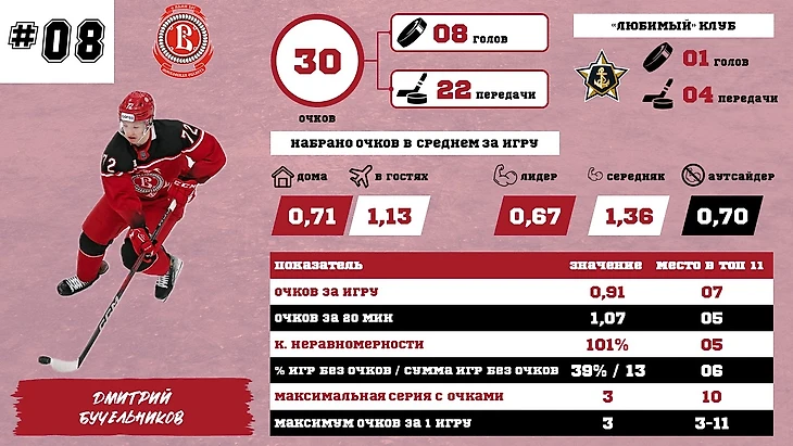 Дмитрий Бучельников по статистике во многом похож на Чеховича, (с еще более явным уклоном в голевые передачи), а потенциально даже немного похуже. Тем не менее, в Витязе пока именно он является лидером по набранным очкам.