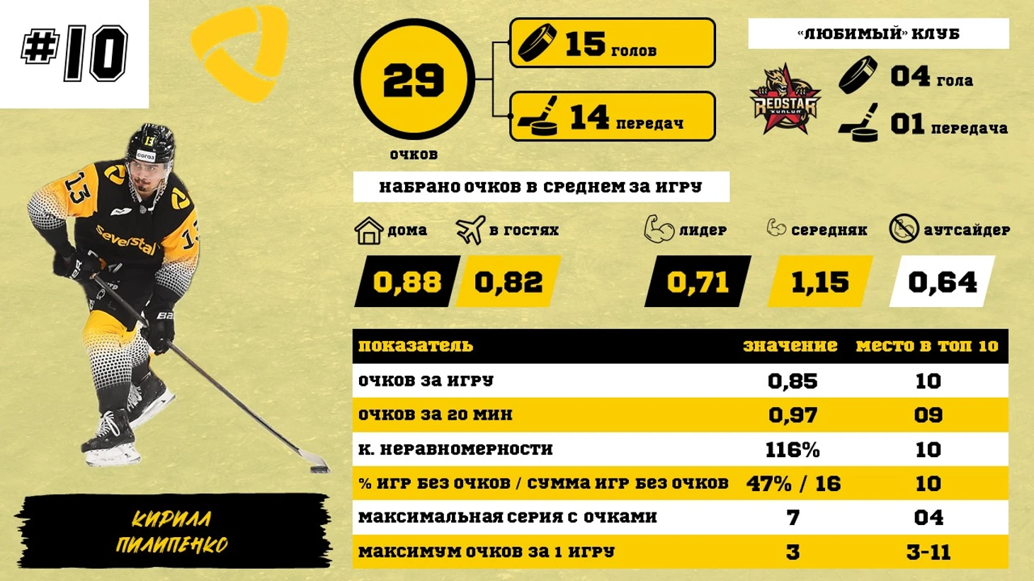 В этом году Кирилл Пилипенко снова показывает хорошую результативность и борется за попадание в тройку лучших бомбардиров.