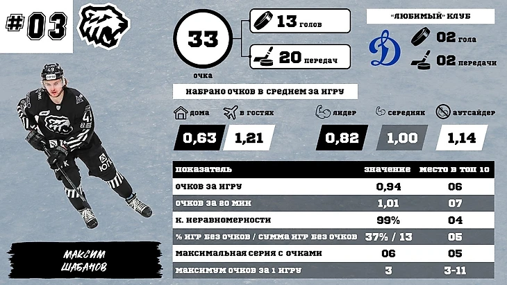 Максим Шабанов периодически выходит на первое место, и после половины сезона отстает всего на 1 очко. Но его главный минус – нестабильность: очки набирает всплесками, для одного из лидеров у него многовато игр без набранных очков. Думаю, что в пятерку он попасть должен, но в тройке вряд ли удержится.