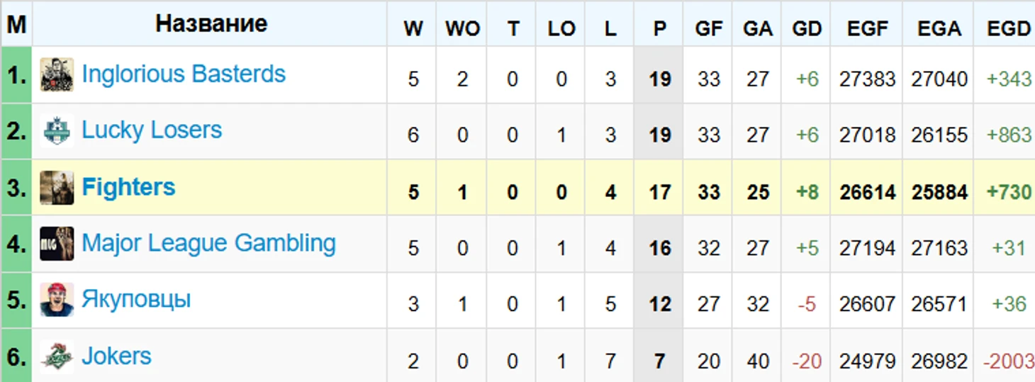 На последнем месте команда Jokers, имеющая всего 7 очков и одержавшая лишь 2 победы. Очень сложное положение у команды, обязывающее одерживать победы во всех встречах во 2-м круге.
