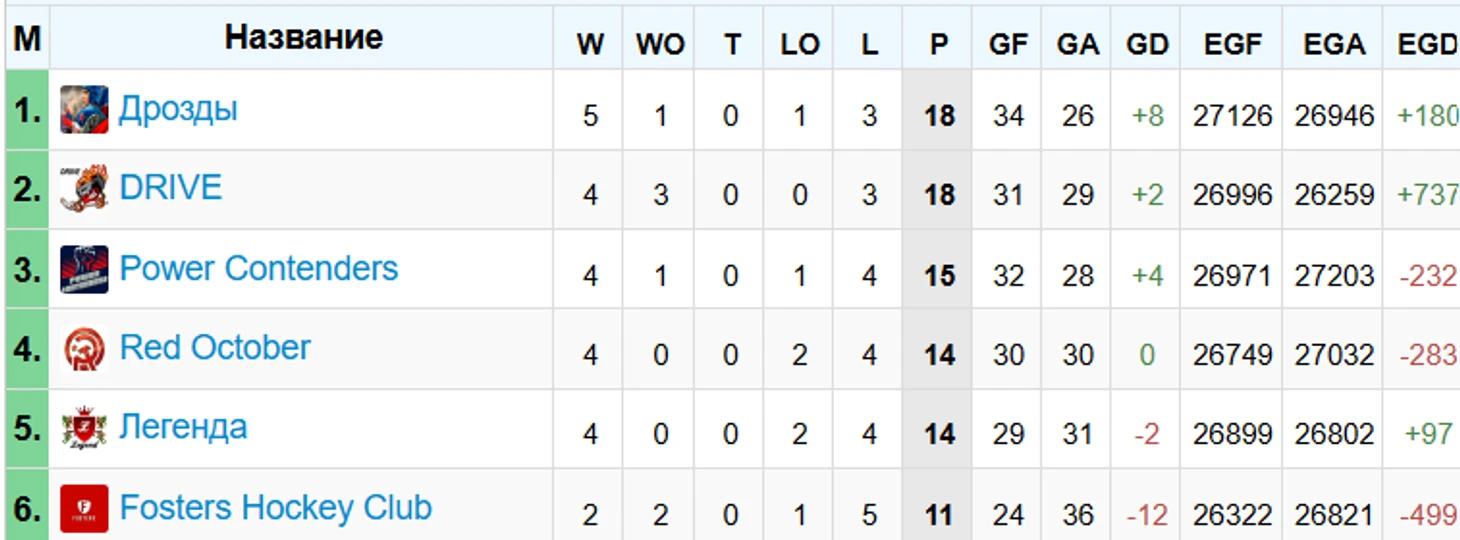На последнем месте команда Fosters Hockey Club, имеющая 11 очков, но отстающая всего на 3 очка от стоящих выше команд, так что вся борьба еще впереди.