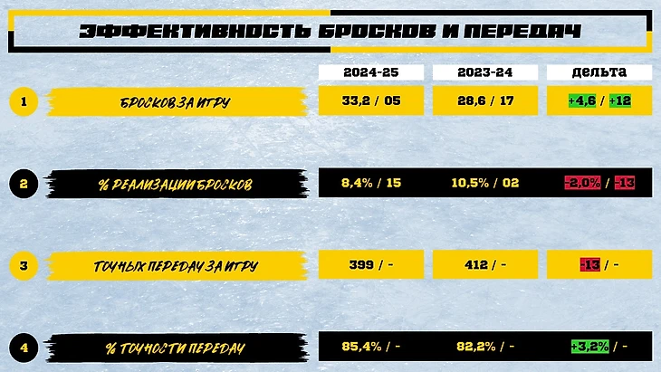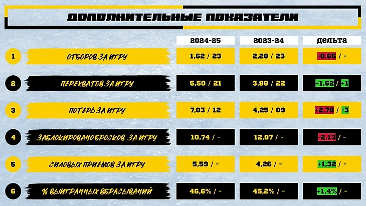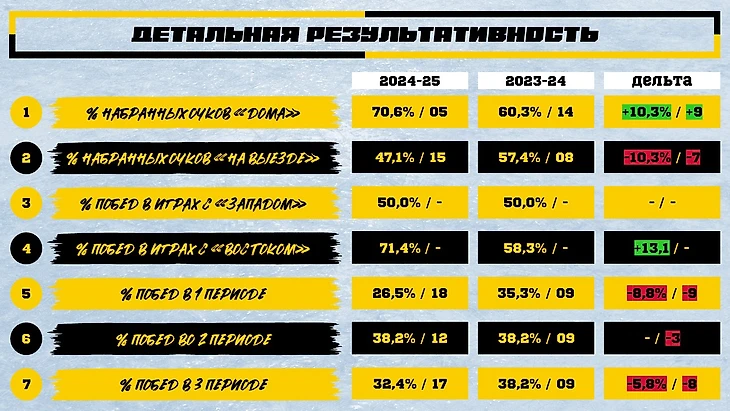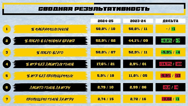 Ниже представлена самая простая информация: результаты за этот сезон и место среди всех команд по показателю (указано через «/»), результаты за прошлый сезон (и также место) и дельта – насколько сильно изменилась статистика. Так как показатели разные, и оцениваются по-разному (меньше-лучше или больше-лучше), для удобства все изменения в пользу текущего сезона выделены зеленым, в пользу предыдущего красным. Для дельты по местам «+» это значит поднялся на Х мест, а «-» опустился на Х мест.