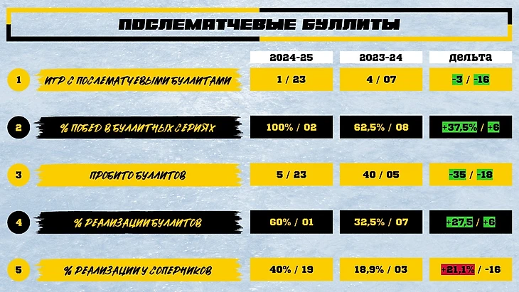 6. Бонусом идет сравнение игры в послематчевых буллитных сериях. В этом году таковых была всего одна и, причем, достаточно короткая, поэтому сравнение не очень корректное и выводы по нему делать нет смысла.