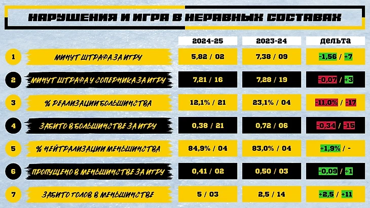 3. Нарушения и играв неравных составах. Большинство – это боль, нет смысла еще раз обсуждать. А вот меньшинство улучшилось и, что еще важно удаляться стали меньше почти на целый малый штраф. Также интересный факт, что забито в меньшинстве уже столько же, сколько и за весь прошлый год.