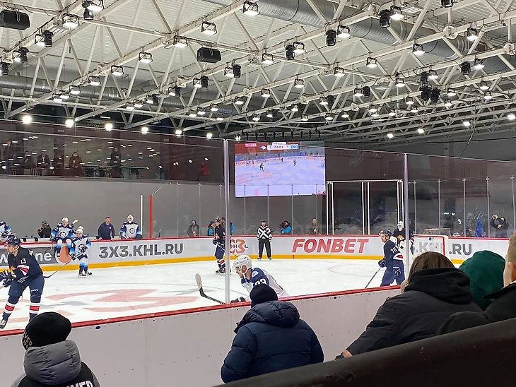 Первое явное отличие – непривычно маленькая площадка. Она значительно меньше стандартной: 34 на 18 метров для хоккея 3х3 (в КХЛ – 60 на 30). Захватить весь обзор на камеру телефона без проблем получается даже с близкого расстояния.