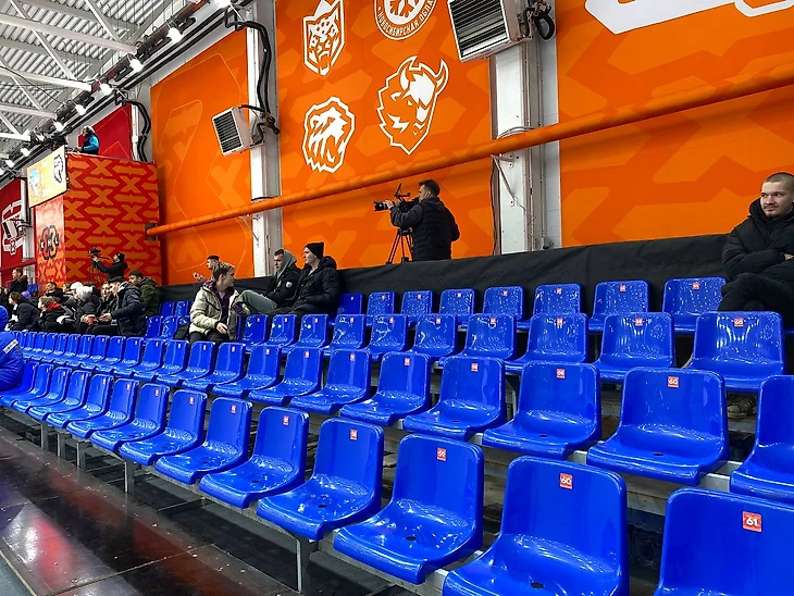 Мест для зрителей тоже очень мало. Четыре ряда трибун расположены только вдоль одного борта напротив скамеек игроков. Всего в продаже 250 билетов за 100 и 150 рублей. Разница между ними практически нет. Поскольку площадка намного меньше стандартных размеров, обзор хороший с любого ракурса. Один билет действует на все матчи одного дня тура.