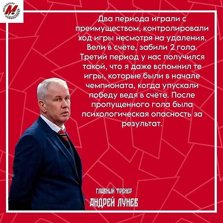 Заключительная 20-минутка прошла под контролем команды гостей. На пятой минуте периода отставание в счете сократил Тимур Шарифьянов. В этом моменте казалось, что гости смогут отыграться. «Металлург» не раз в текущем сезоне отдавал матч, ведя 2:0. Об этом на пресс-конференции сказал и Андрей Лунев, главный тренер команды.
