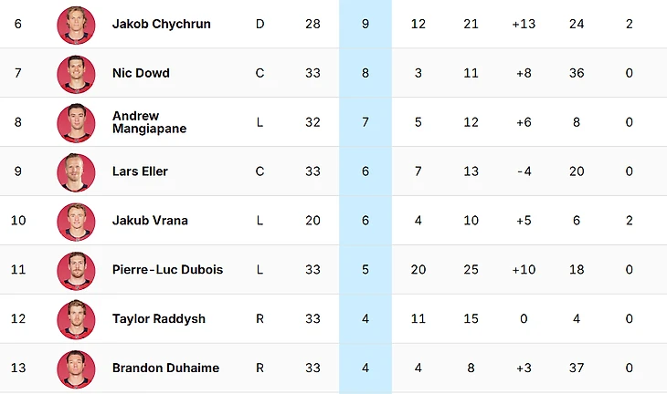 Я вновь и вновь не устану повторять, что в этом сезоне линия нападения, в том числе и их игра в защите, вышла на принципиально новый уровень. Верхние звенья тащат, нижние подтаскивают, причем делают все это очень стабильно и ровно. Приведу таблицу для наглядности. Для информации — с этими парнями заключены контракты, которые истекают только у первых двух в 2025 году. Все отрабатывают их по полной! У Уилсона и Дюбуа контракт до 2030, у Протаса до 2028, у Строума до 2027.