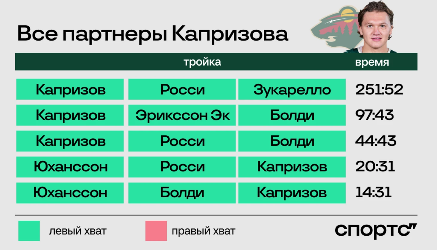 Да, вы правильно разглядели: при 5-на-5 в этом чемпионате Капризов играет только с леворукими партнерами. Это нетрудно объяснить, потому что праворуких нападающих на весь состав «Уайлд» двое – Хартман и Гудроу, и эти двое еще те плеймейкеры.