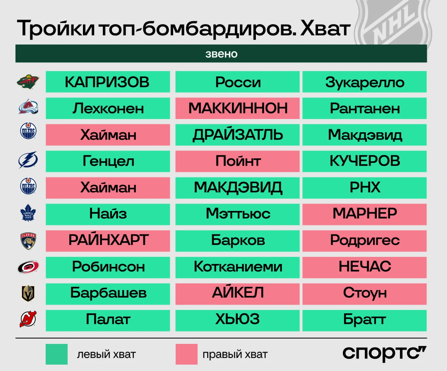 Да-да, все верно: почти все прямые конкуренты Капризова за условный «Харт Трофи» играют в тройках смешанного по хвату состава. Проще говоря: у всех есть партнер другого хвата, с которым можно моментально сыграть в пас.