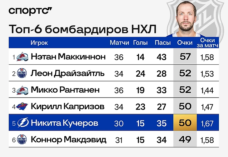Это 50-е очко Никиты в сезоне-2024/25. Он достиг этой отметки раньше всех россиян – через несколько часов то же самое сделает Кирилл Капризов. В таблице лучших бомбардиров НХЛ Кучеров идет в топ-5 – хотя сыграл на несколько игр меньше тех, кто выше него: