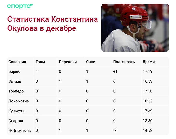 Прямо сейчас Окулов – седьмой бомбардир ЦСКА. За 36 матчей он набрал 16 (5+11) очков с полезностью «-5». В его игре были отдельные всплески: против «Адмирала», «Амура» и «Куньлуня» набирал по 2 очка. Последний раз подобное происходило в октябре. После этого Окулов чаще терялся, а результат делали другие. Например, тройка Полтапов – Соркин – Абрамов.