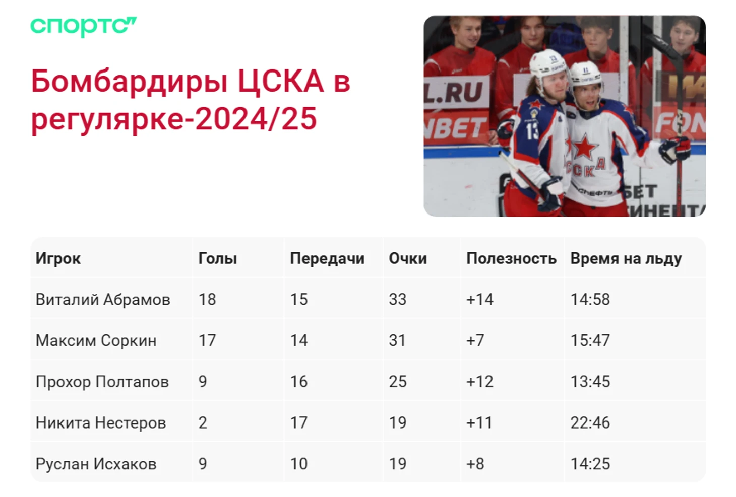 Настоящие лидеры все-таки остаются привычными на протяжении всей регулярки-2024/25. Виталий Абрамов, Максим Соркин и Прохор Полтапов проводят лучший сезон в карьере. Каждый из них всего за четыре месяца перекрыл (в случае Соркина – повторил) все личные достижения из прошлого. Это же отражается в командном списке бомбардиров, где им вообще нет равных.