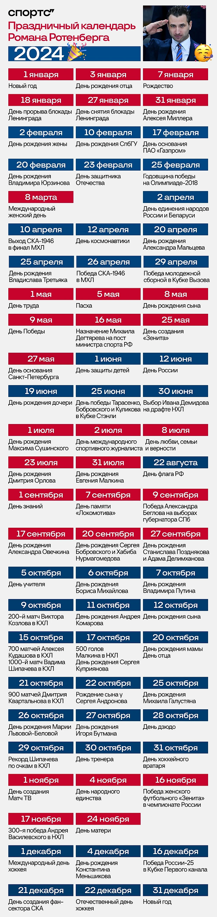 Ротенберг все время кого-то поздравляет: соперников, чиновников и всю страну. Вот календарь его праздников