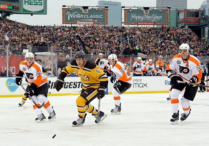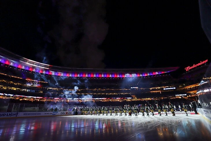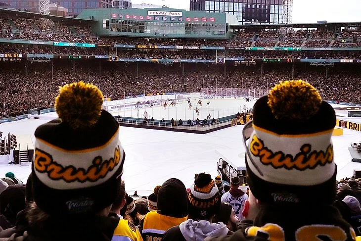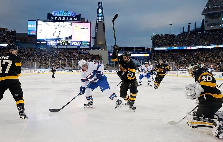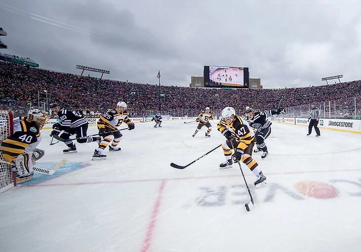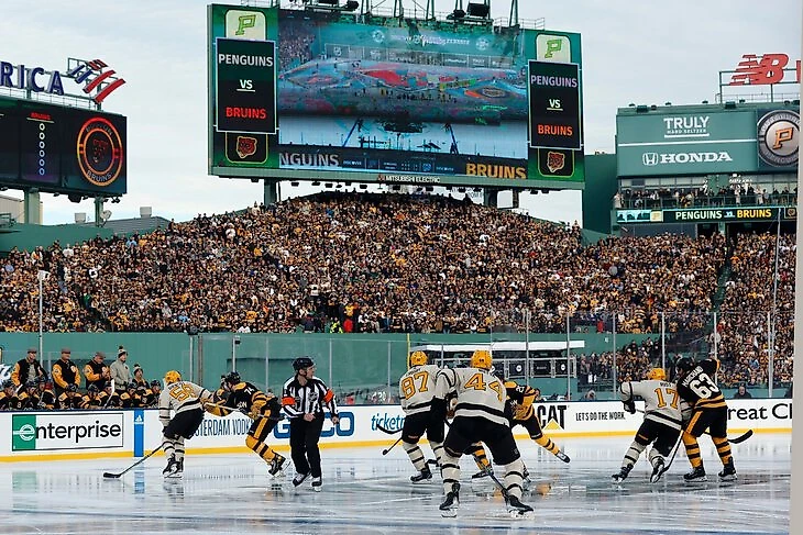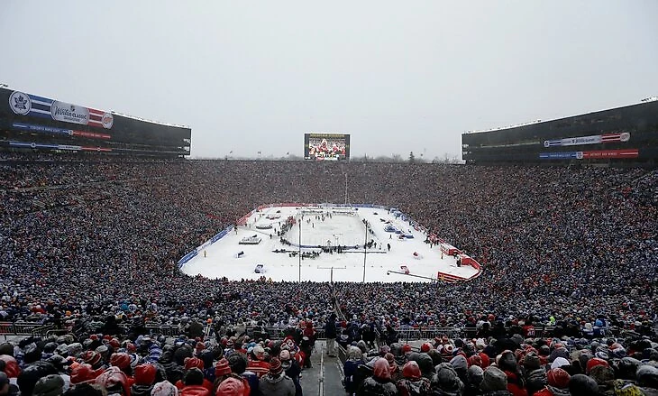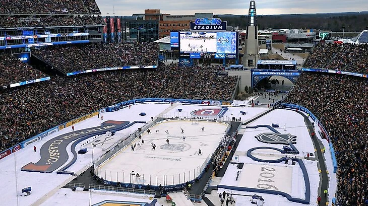 Одно из самых принципиальных противостояний в истории хоккея не могло пройти мимо матчей под открытым небом. На массачусетском «Джиллетт Стэдиум» собрались 67246 зрителей, которые были вынуждены наблюдать, как местная команда проигрывает канадцам.