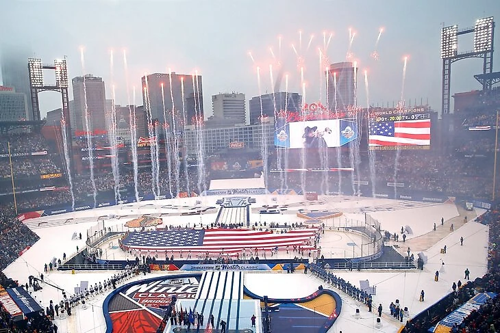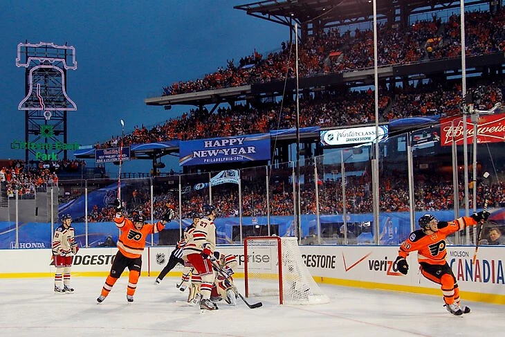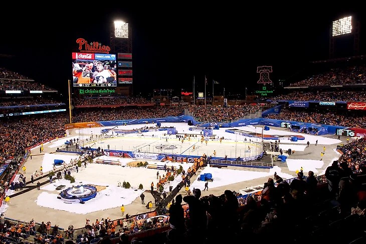 Первый матч, который прошел не 1 января, а днем позже – чтобы не накладываться на домашнюю игру «Филадельфии Иглс» в НФЛ и не делить зрителей. Хоккейную игру провели на бейсбольной арене, собрав 46967 болельщиков.