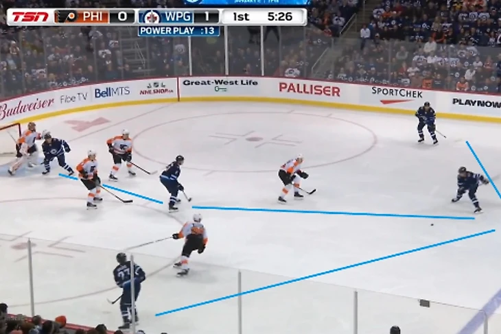 При этом в зоне соперника, профессионалы разыгрывают классический «зонтик»: 1-3-1. Пересмотрите второй гол (таймкод с 6:10 на видео вверху). Нападающий получает именно так шайбу от, возможно, вкатывающегося игрока, и бьет по воротам от синей линии.