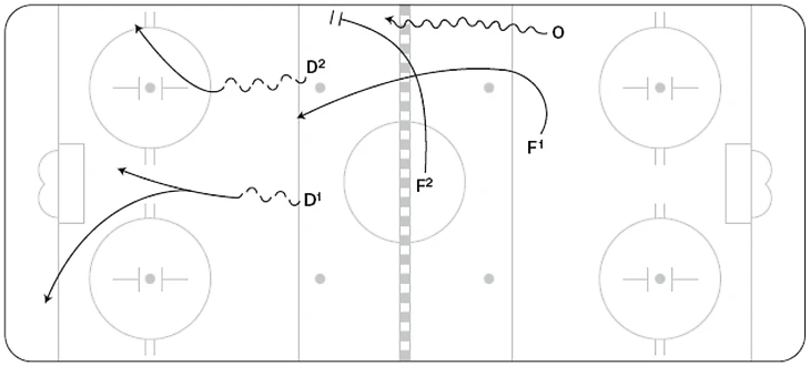 Вот как его описывает классический хоккейный учебник по тактике: F1 разворачивает владеющего шайбой игрока на внешний край. F2 пытается противостоять входу в зону на синей линии или вынудить владеющего шайбой игрока сделать вброс. D2 отправляется за шайбой в случае проброса за спину. Под давлением со стороны F1, F2 и D2 игрокам большинства, как правило, удается войти в зону с шайбой, только если они делают пас на свободный фланг. При вбрасывании шайбы в зону D1 отправляется в угол, а F1 и D2 страхуют его. F2 отвечает за пятачок.
