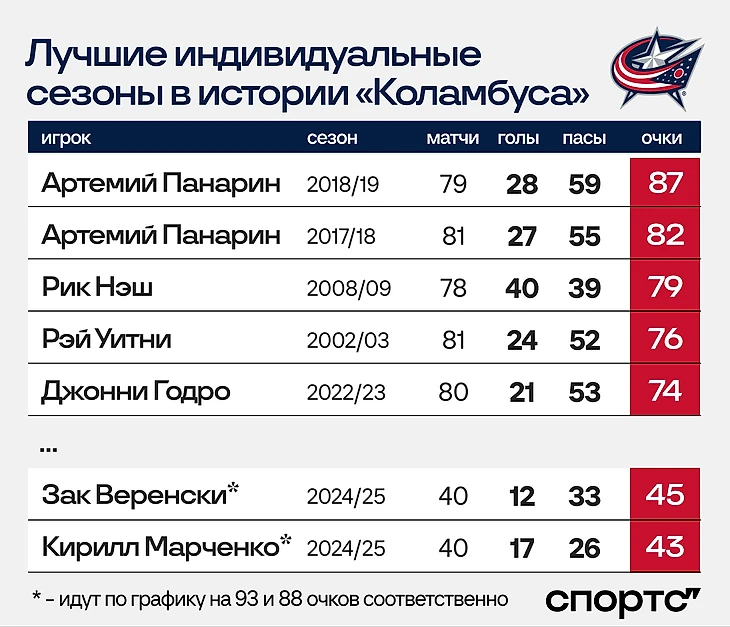 Теперь Веренски может войти в историю франшизы. Потенциально он идет на 93 очка в регулярке. Если серьезных отклонений в худшую сторону от графика не случится, то Зак установит новый рекорд для игроков «Коламбуса» по очкам за сезон.