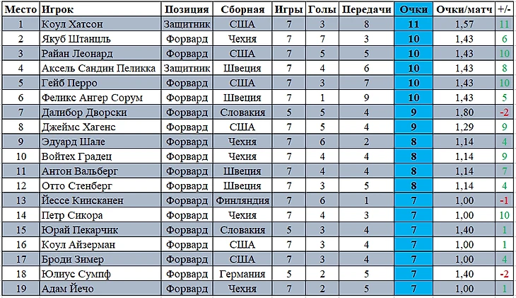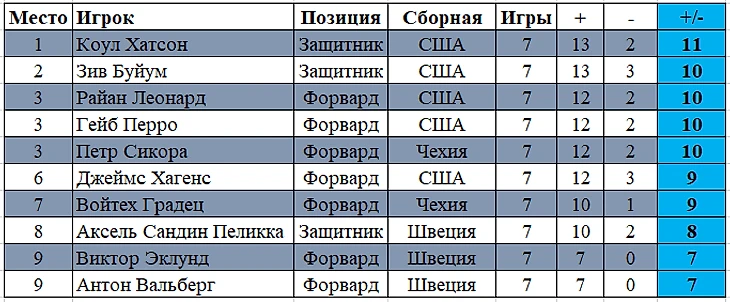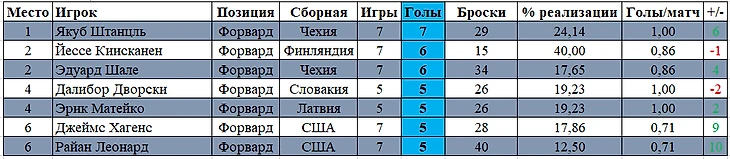 Привел 7 игроков в списке снайперов, так как по 4 шайбы забросили еще 6 игроков.