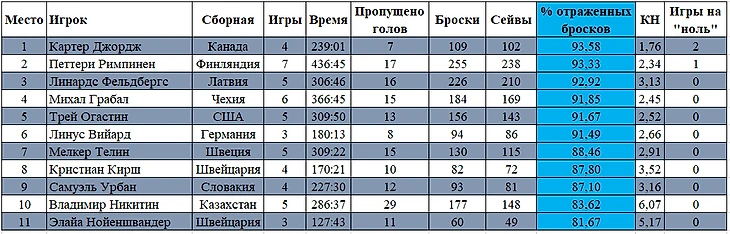 Второе место заняла сборная Финляндии, пропустившая всего 2 шайбы на 21 попытку, на 3 месте расположились словаки,которые также пропустили 2 шайбы, но за меньшее количество попыток (12).