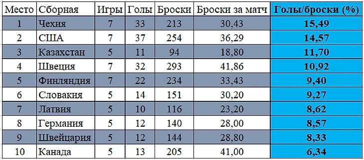 В последний игровой день группового этапа было сыграно 4 матча, выделил бы 2 из них, в которых встречались претенденты на медали: Швеция – Чехия и США – Канада. Обе игры были интересными и напряженными, и в обеих встречах номинальные фавориты одержали победу. Статистика бросков в матче США – Канада (39 на 28 в пользу канадцев) не должна вводить Вас в заблуждение, большинство бросков были из углов и от синей линии. Вообще у Канады по всему турниру в среднем больше всего бросков было нанесено, но все они были как будто просто для статистики. Ниже в таблице по бросковой эффективности это будет отлично видно.