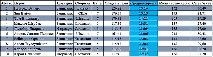В 10 лучших по игровому времени всего 2 форварда и оба нападающих из сборной Словакии – Далибор Дворски (23:09) и Юрай Пекарчик (проспект «Сент-Луиса», 22:32).
