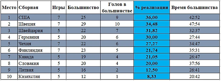 Сборная США продемонстрировала наилучшие показатели по реализации большинства – 36 %. Второе место по этому показателю заняла сборная Швеции, игроки которой забросили наибольшее количеств шайб в большинстве, но и попыток у них было больше всех.