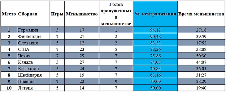 Лучшими по нейтрализации большинства соперников на турнире стали игроки сборной Германии, которые пропустили всего одну шайбу в меньшинстве (при 17 попытках).