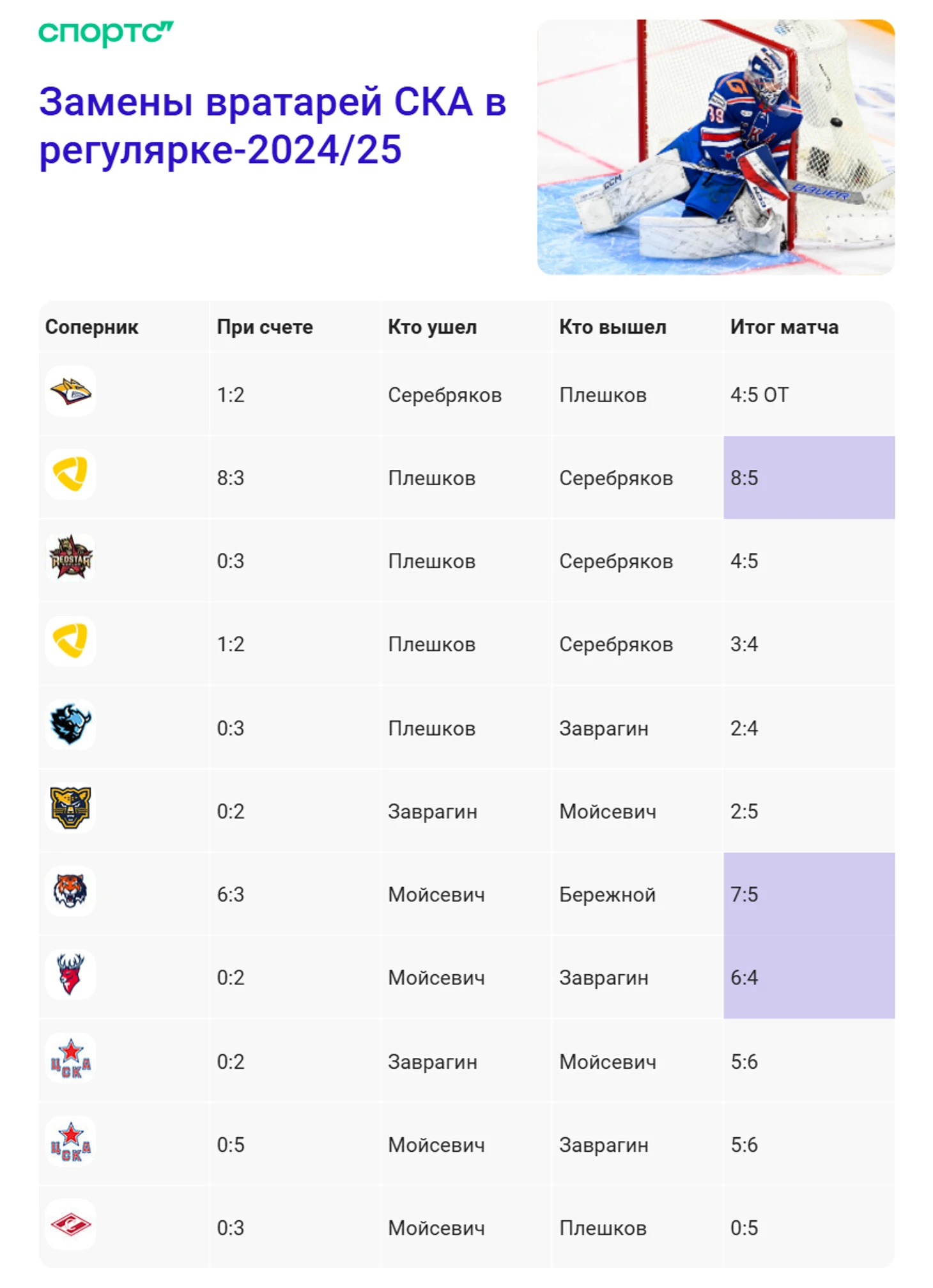 Интересно, что сезон-2024/25 стартовал для СКА как раз с замены вратаря. 5 сентября СКА проиграл «Металлургу» (4:5 ОТ). Уже на 22-й минуте там появился Артемий Плешков – он сменил Никиту Серебрякова при счете 1:2. Пусть СКА ту встречу и проиграл, но хотя бы заработал очко. Серебряков позже совсем ушел из клуба – сейчас он регулярно появляется в основе «Авангарда».