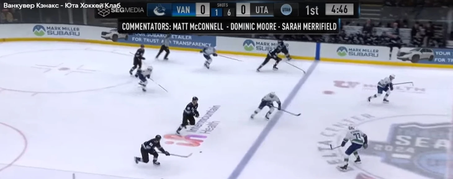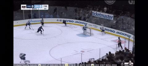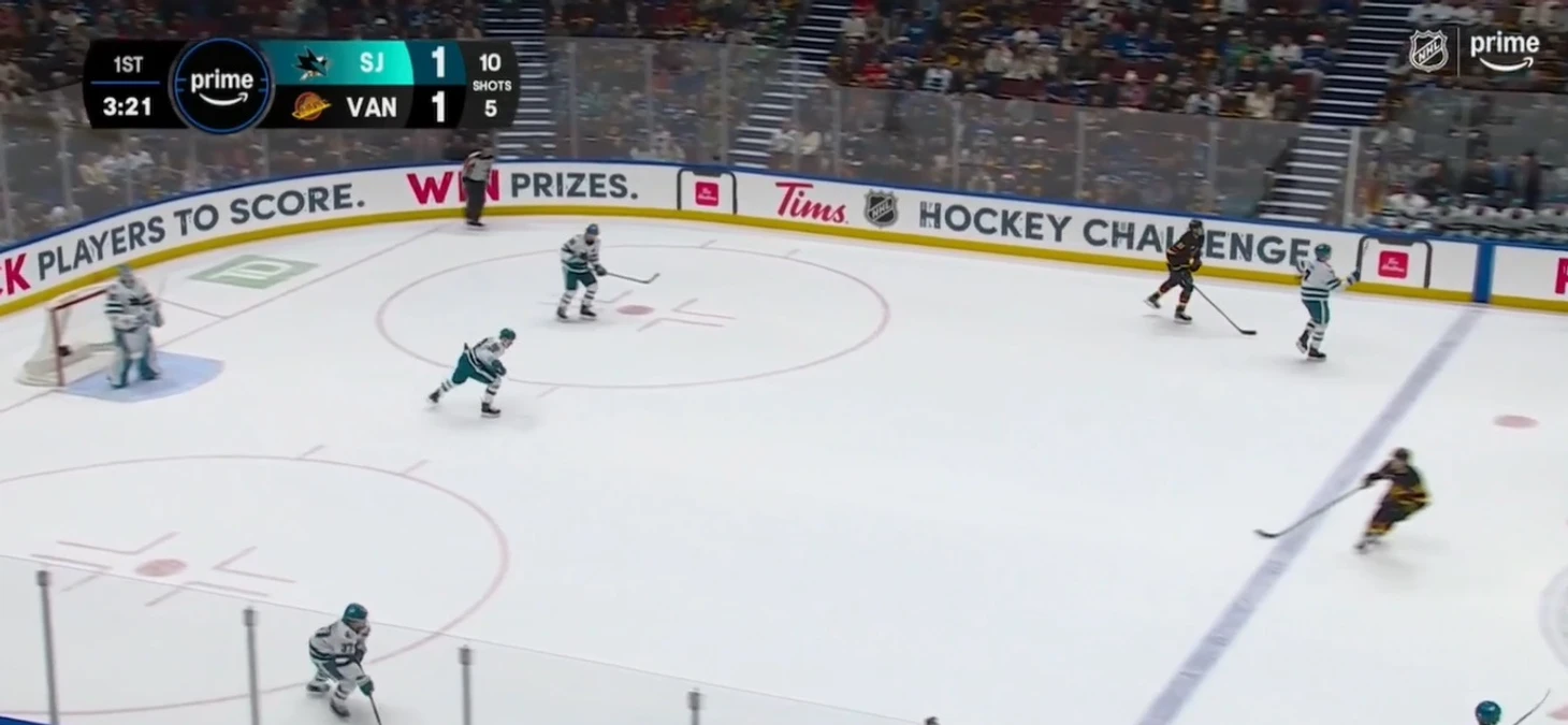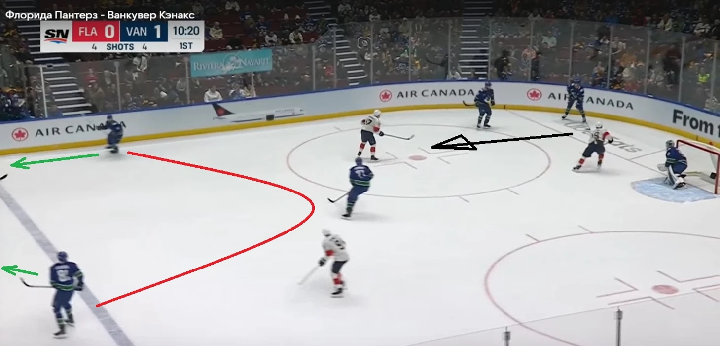 Теперь смотрим, как работают хоккеисты «Ванкувера». Вот тут «Сан-Хосе» выходит из обороны во время пересменки «Кэнакс» без помех.