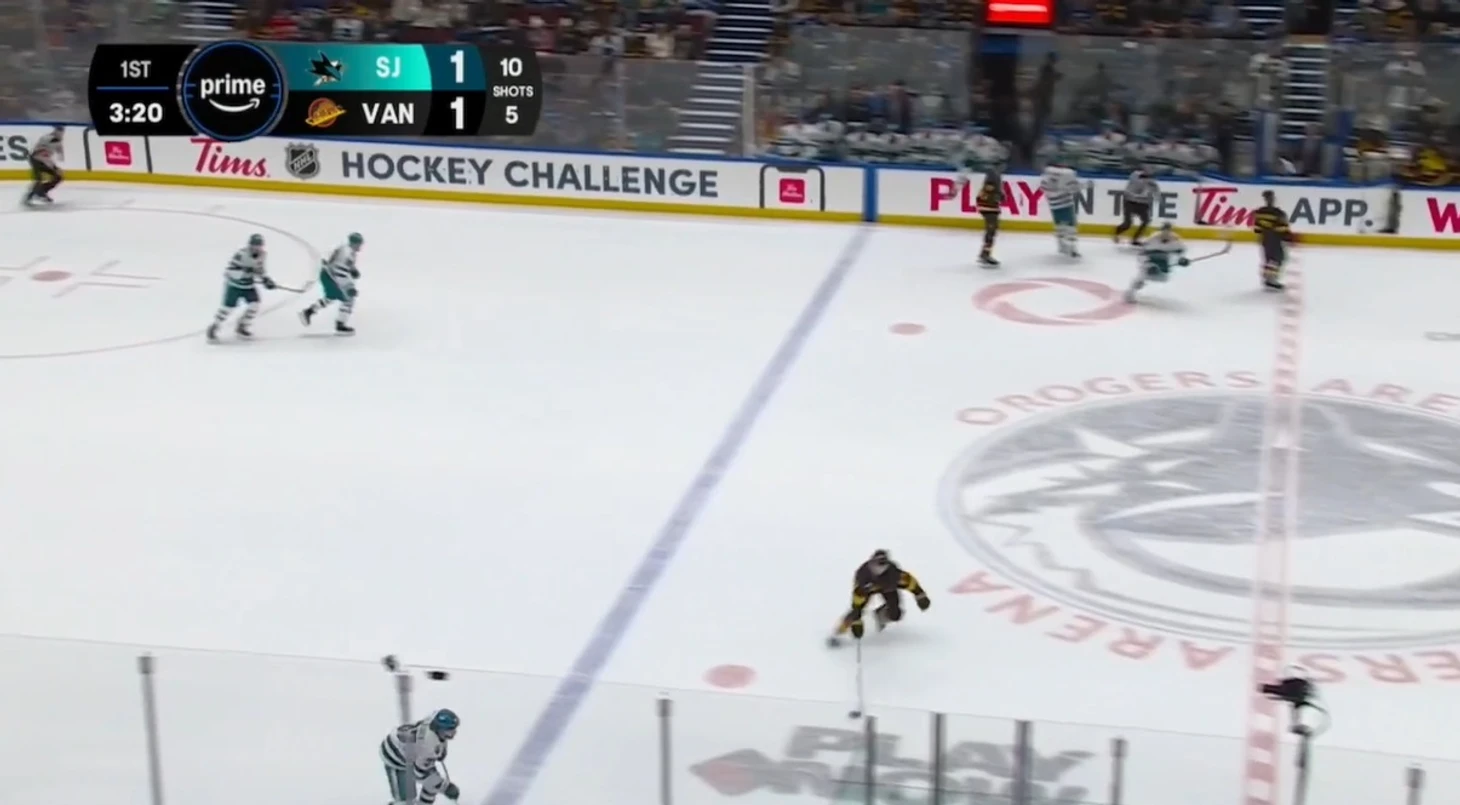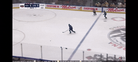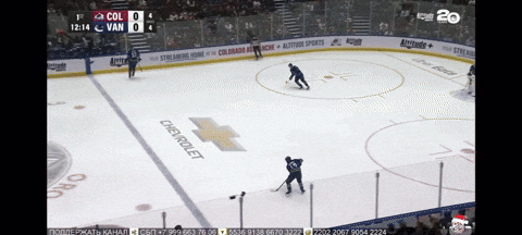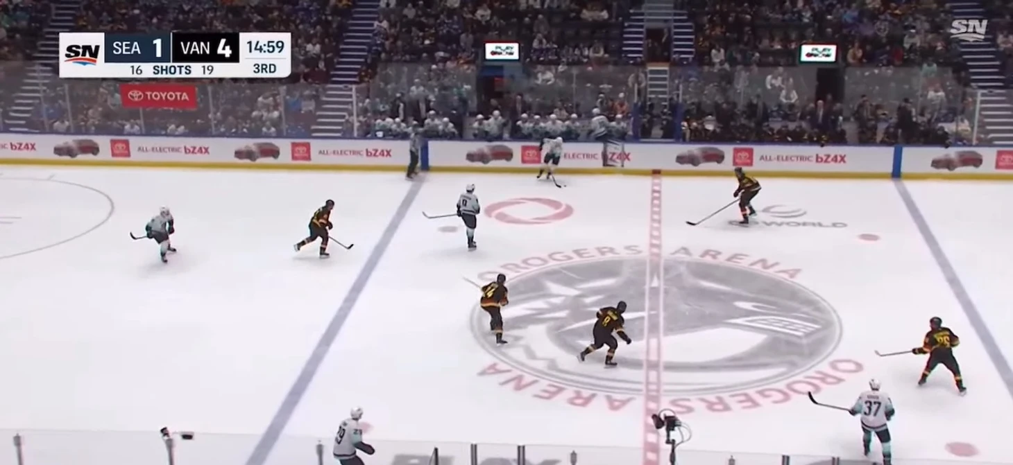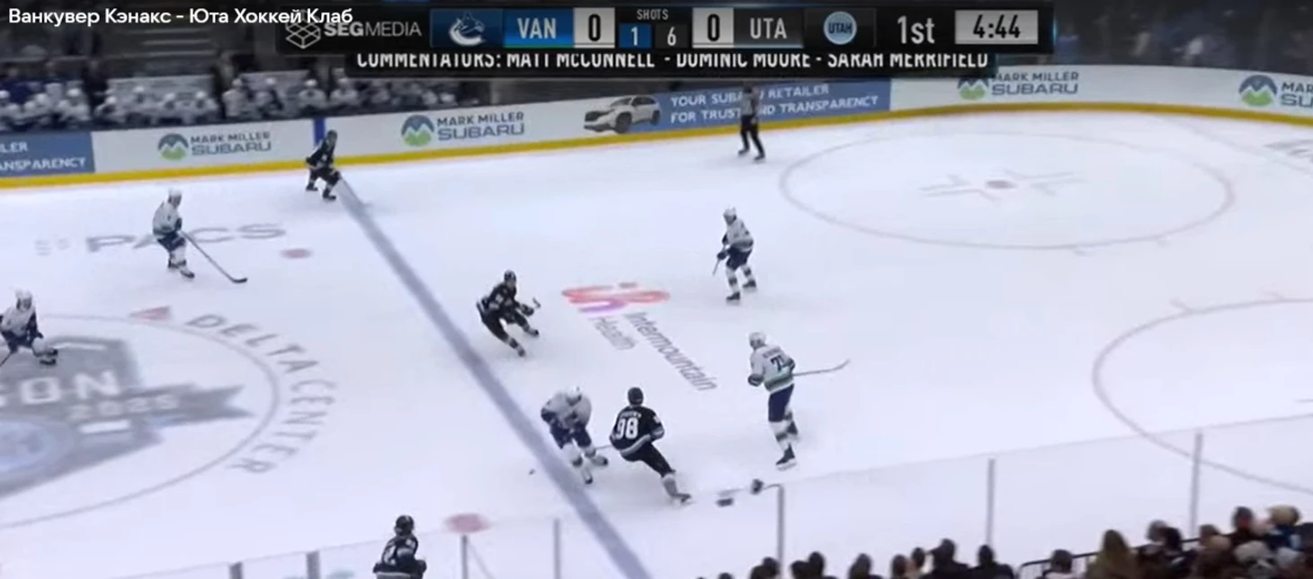 Теперь смотрим, как работают хоккеисты «Ванкувера». Вот тут «Сан-Хосе» выходит из обороны во время пересменки «Кэнакс» без помех.