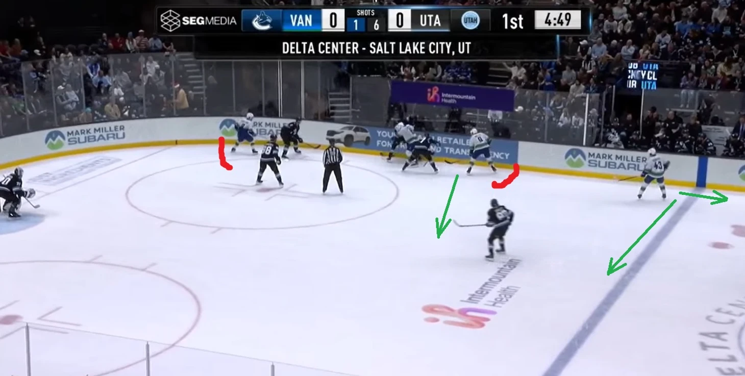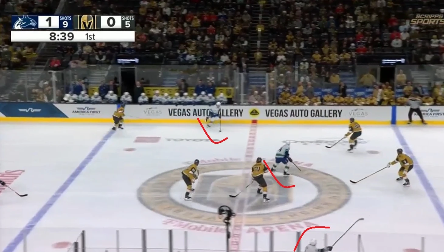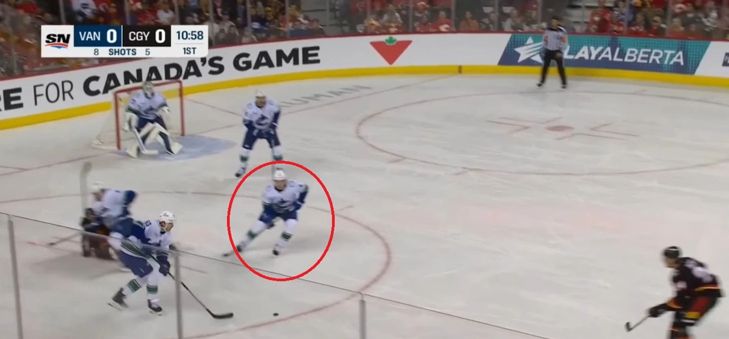В данном случае пошла передача вверх по борту, и, хотя перекрывавший ее Элиас Петтерссон упал, правильная командная работа помогла вернуть контроль: Макс Сассон своевременно успел в борьбу, и в конечном счете шайба досталась защитнику «Кэнакс», пусть и вышла из зоны.