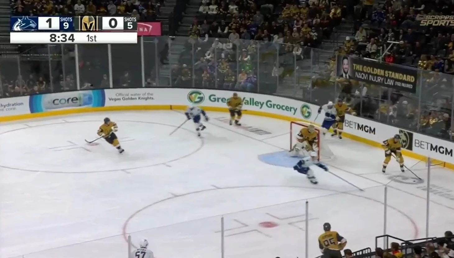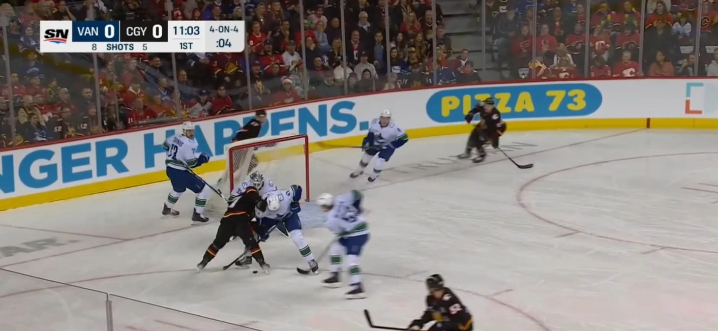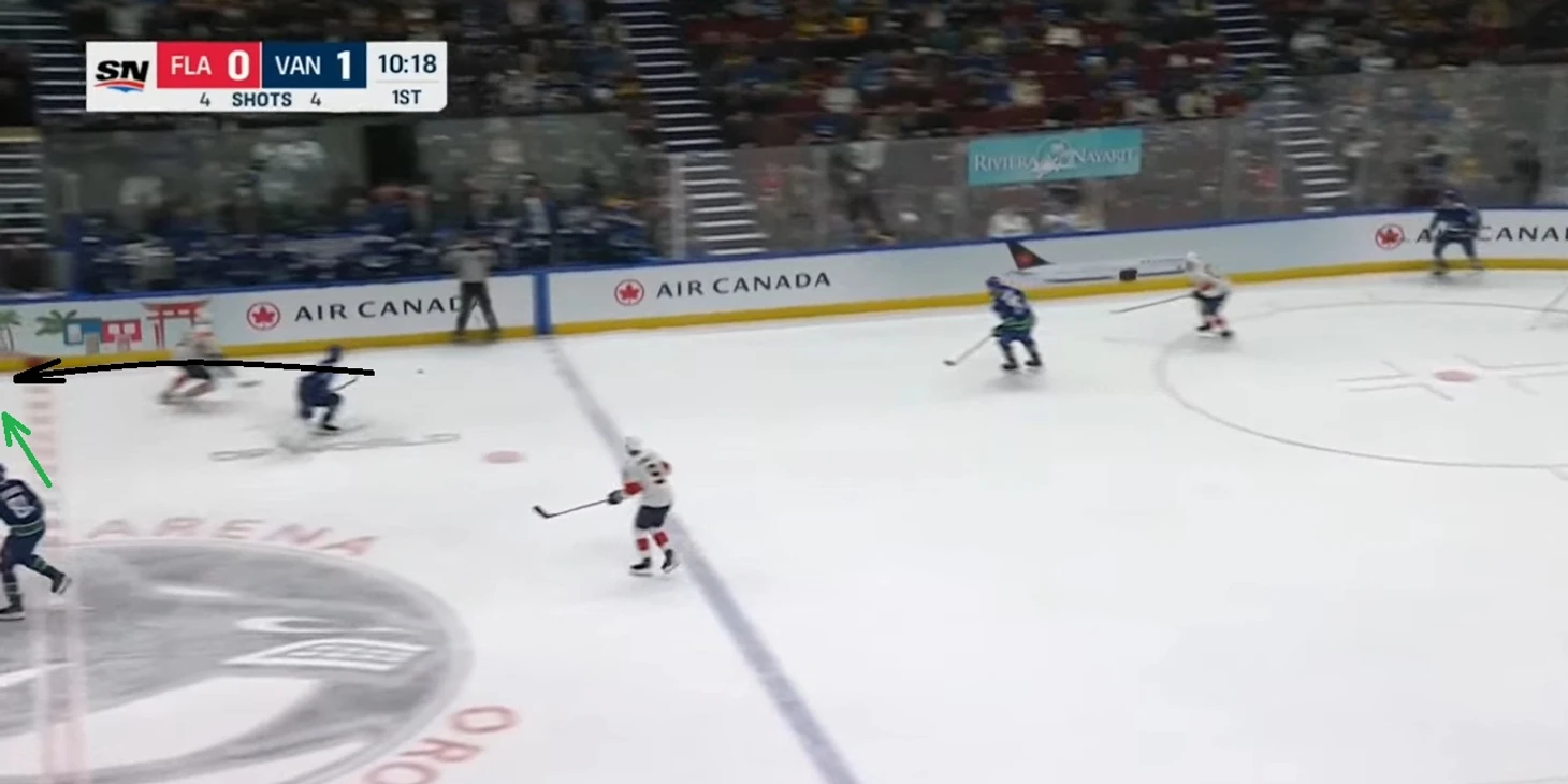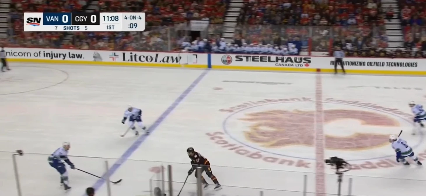 В данном случае пошла передача вверх по борту, и, хотя перекрывавший ее Элиас Петтерссон упал, правильная командная работа помогла вернуть контроль: Макс Сассон своевременно успел в борьбу, и в конечном счете шайба досталась защитнику «Кэнакс», пусть и вышла из зоны.