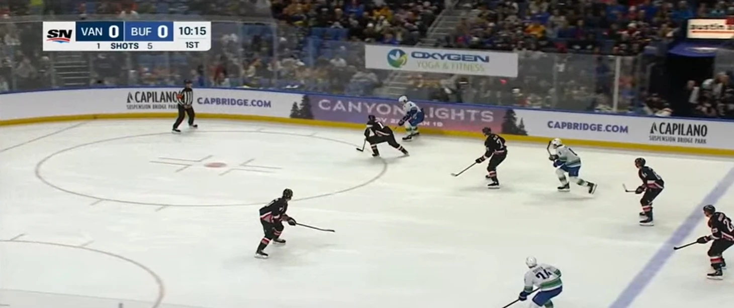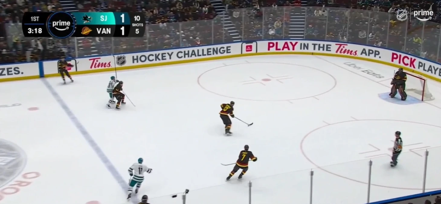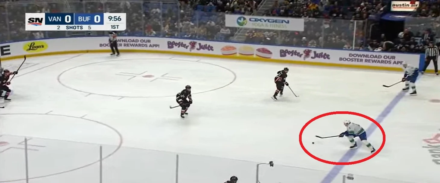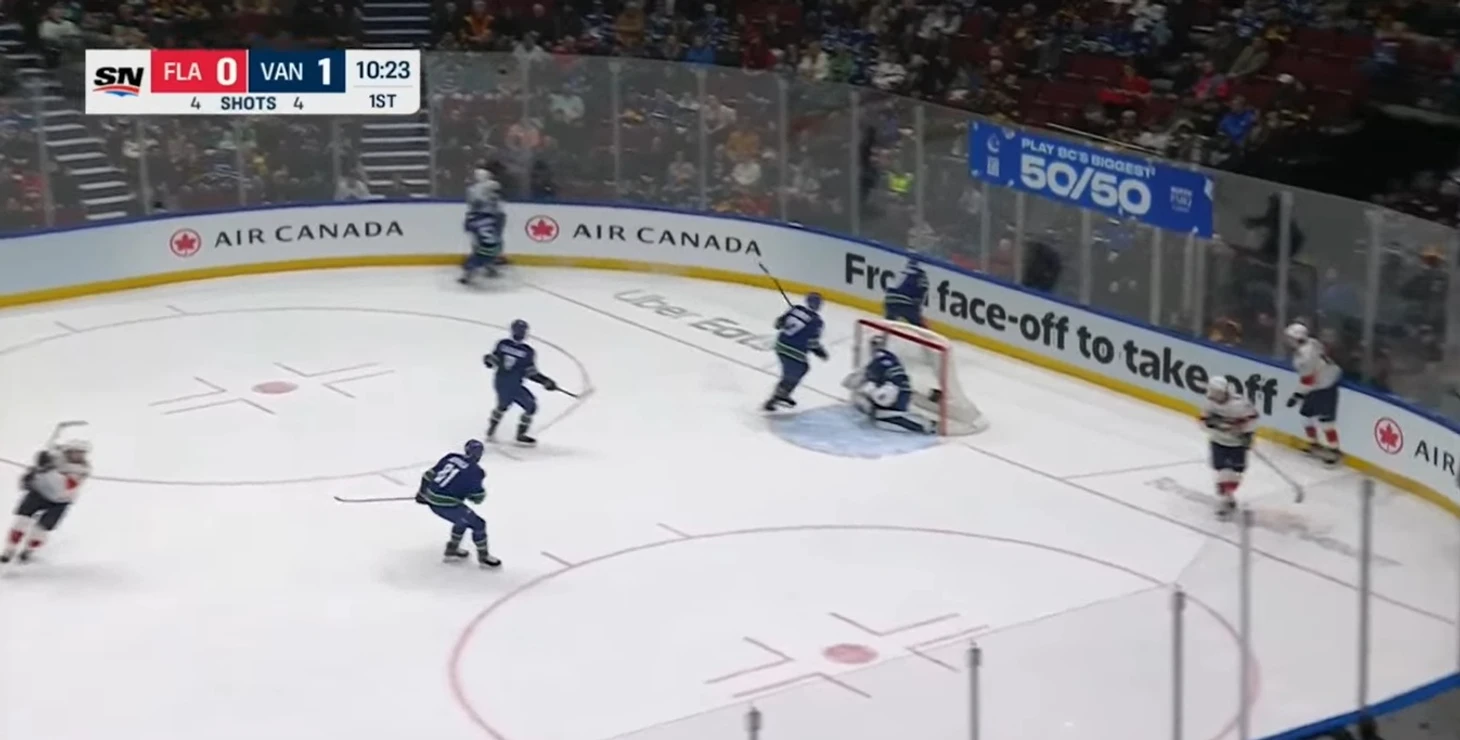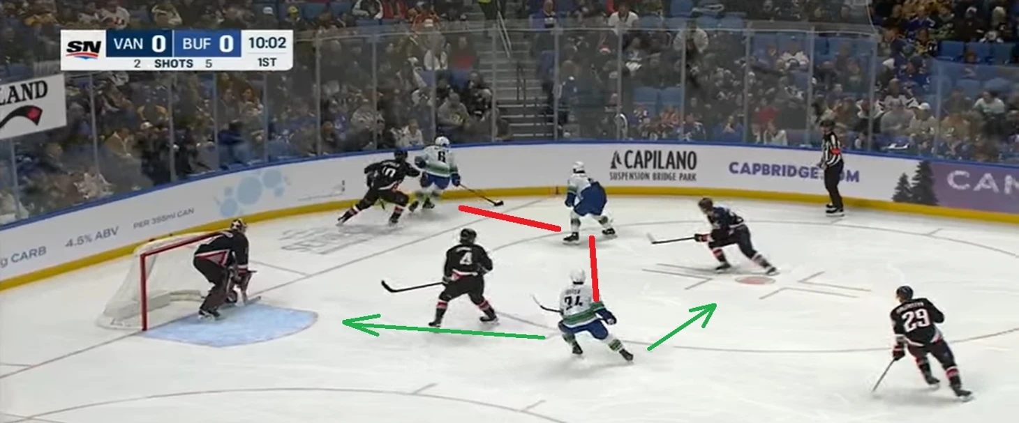Назвать вариант выше новаторством от Токкета сложно – это просто обычная правильная игра для любой команды. Если конкретно о «Ванкувере», то он такой вариант билд-апа использует, возможно, реже, чем хотелось бы, особенно сейчас. Это напрямую связано с кадровой ситуацией. Из защитников на уровне НХЛ эту нехитрую, но требующую точности исполнения комбинацию, могут стабильно реализовывать только Хьюз и Гронек. У всех остальных начинаются проблемы. В данном же эпизоде передачу делал обладающий прекрасным пасом центр Петтерссон.