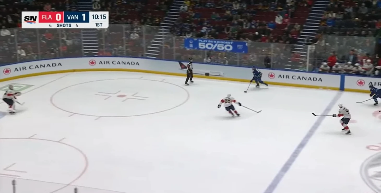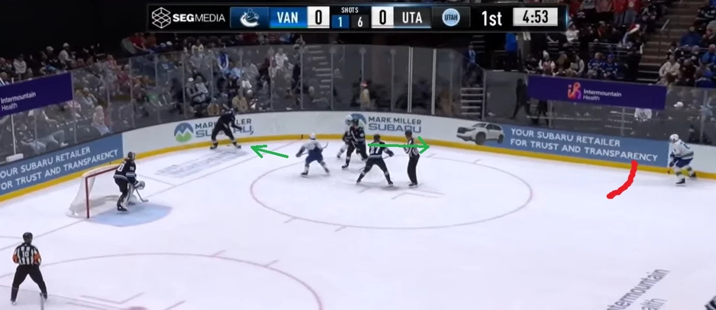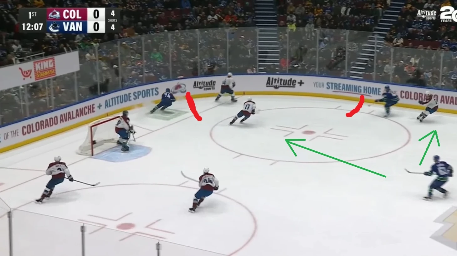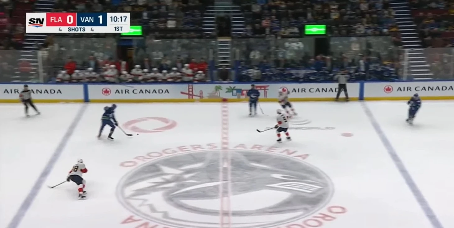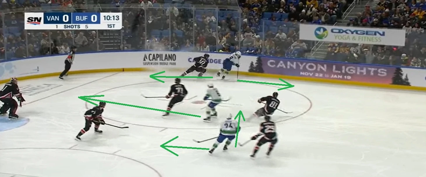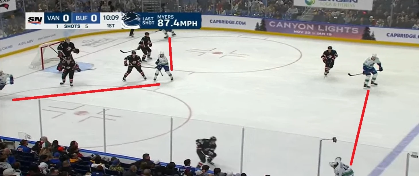 Назвать вариант выше новаторством от Токкета сложно – это просто обычная правильная игра для любой команды. Если конкретно о «Ванкувере», то он такой вариант билд-апа использует, возможно, реже, чем хотелось бы, особенно сейчас. Это напрямую связано с кадровой ситуацией. Из защитников на уровне НХЛ эту нехитрую, но требующую точности исполнения комбинацию, могут стабильно реализовывать только Хьюз и Гронек. У всех остальных начинаются проблемы. В данном же эпизоде передачу делал обладающий прекрасным пасом центр Петтерссон.