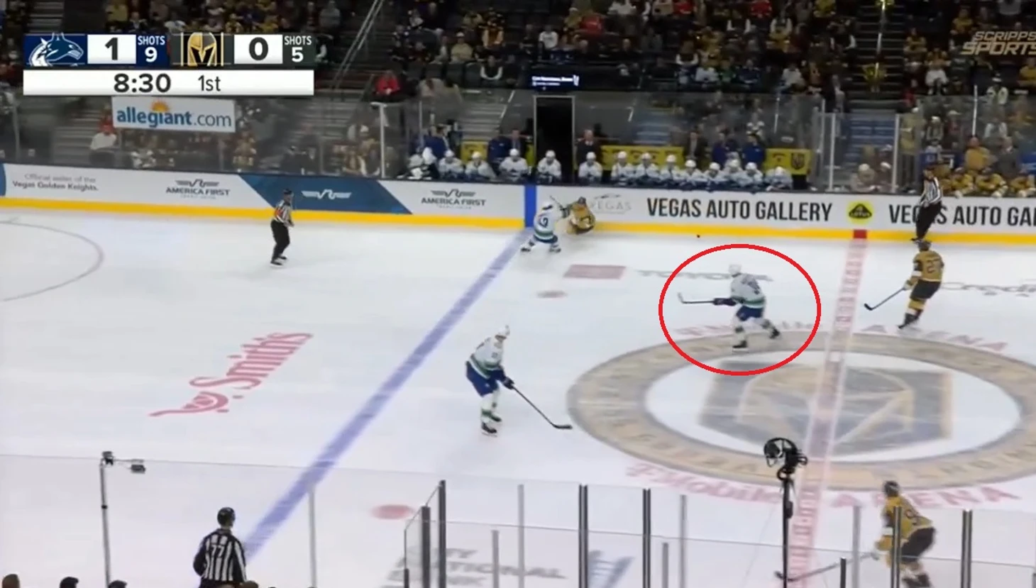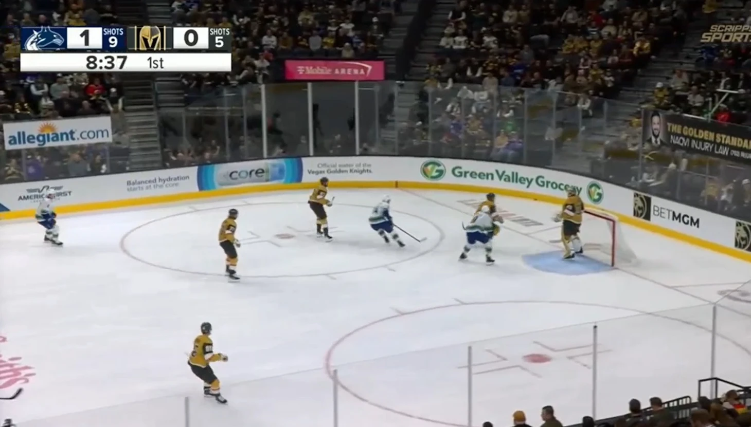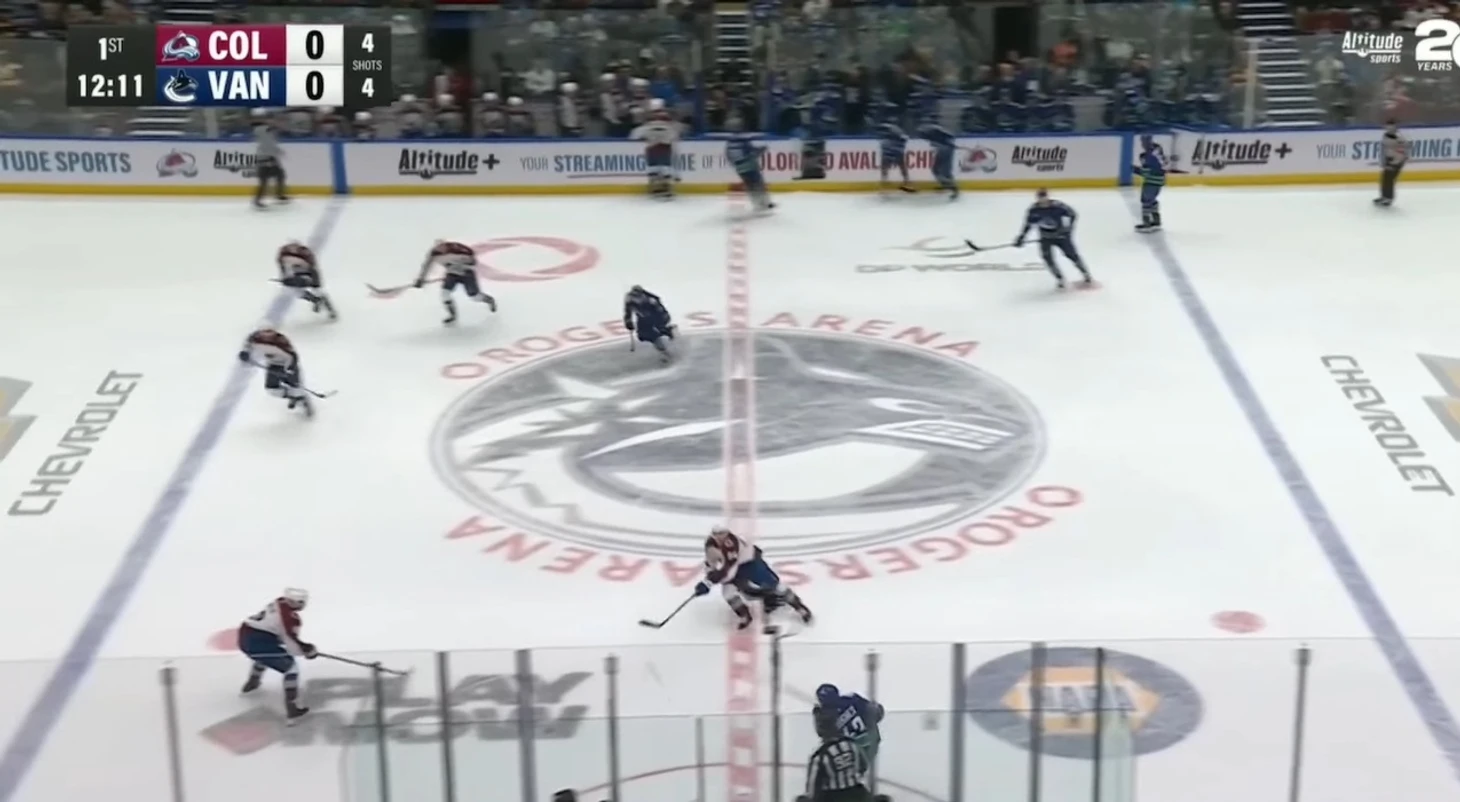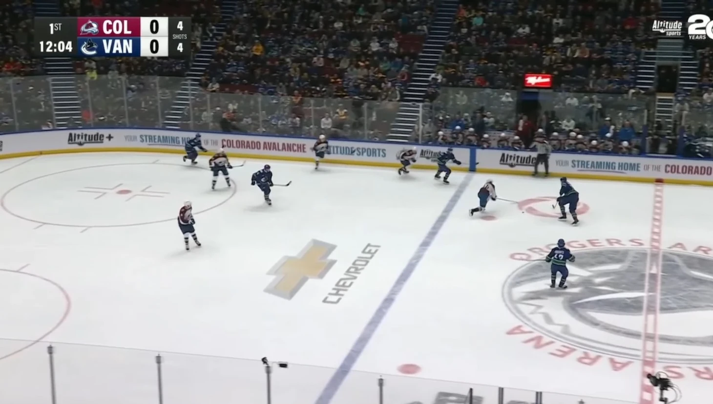 Назвать вариант выше новаторством от Токкета сложно – это просто обычная правильная игра для любой команды. Если конкретно о «Ванкувере», то он такой вариант билд-апа использует, возможно, реже, чем хотелось бы, особенно сейчас. Это напрямую связано с кадровой ситуацией. Из защитников на уровне НХЛ эту нехитрую, но требующую точности исполнения комбинацию, могут стабильно реализовывать только Хьюз и Гронек. У всех остальных начинаются проблемы. В данном же эпизоде передачу делал обладающий прекрасным пасом центр Петтерссон.