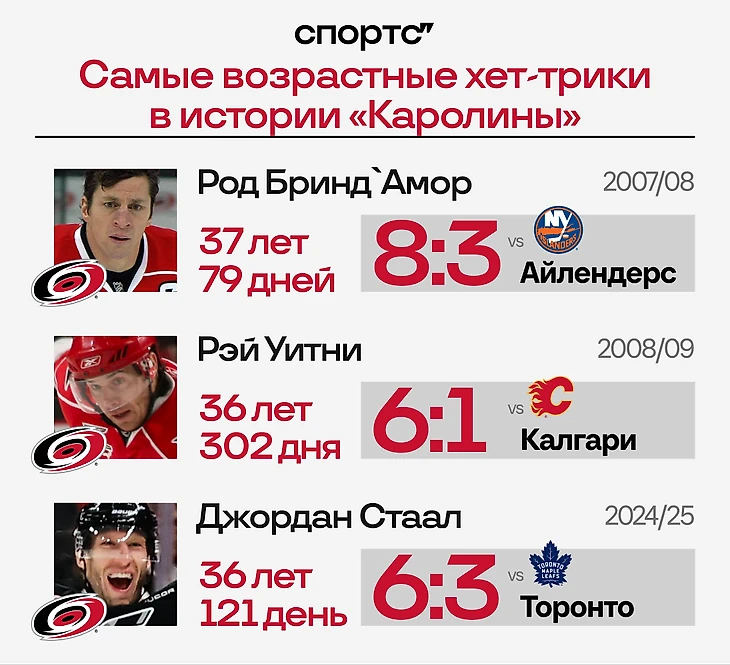 Джордан Стаал – второй хоккеист в истории НХЛ после Яромира Ягра, который делал хет-трики до 19 лет и после наступления 36 лет. В составе «Каролины» он стал третьим хоккеистом, кто оформил хет-трик в таком возрасте – до него это делали Рэй Уитни и нынешний главный тренер Род Бринд`Амор.
