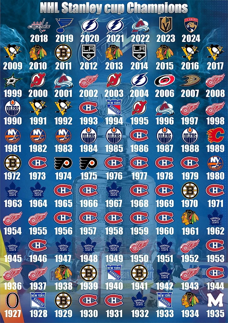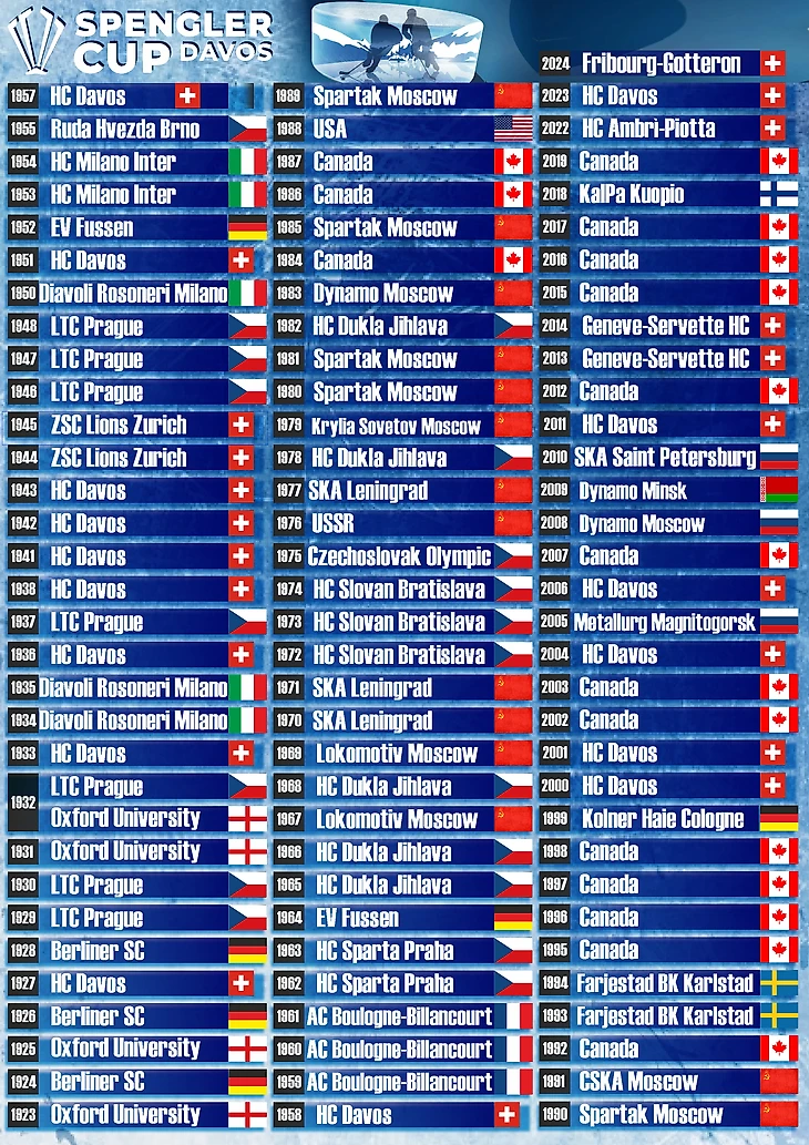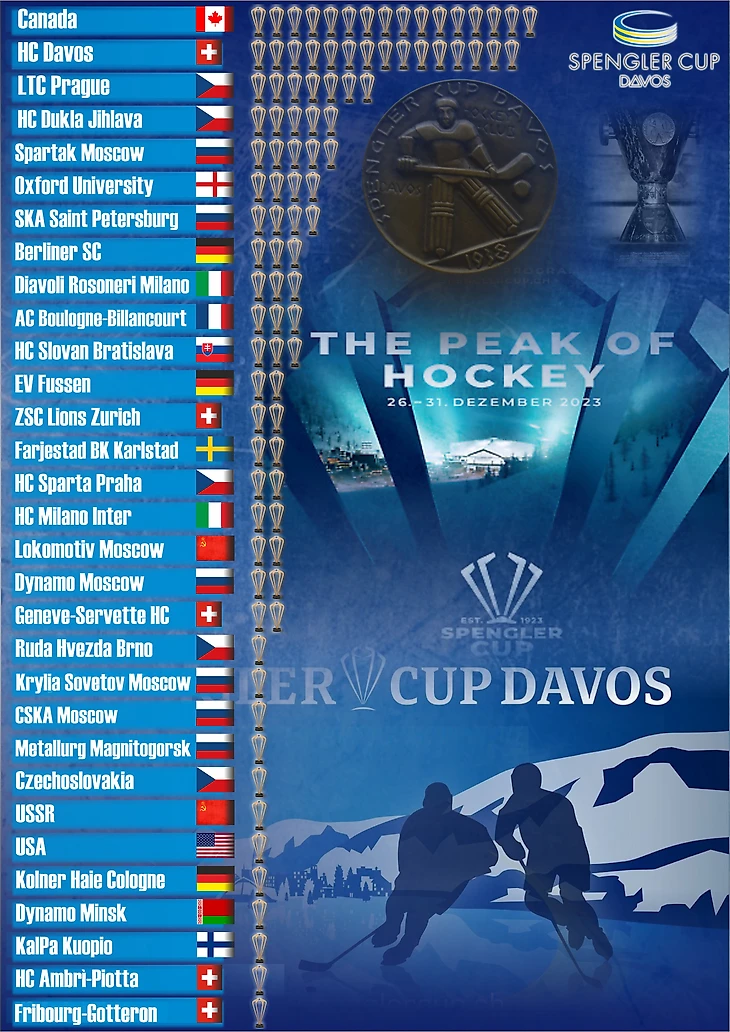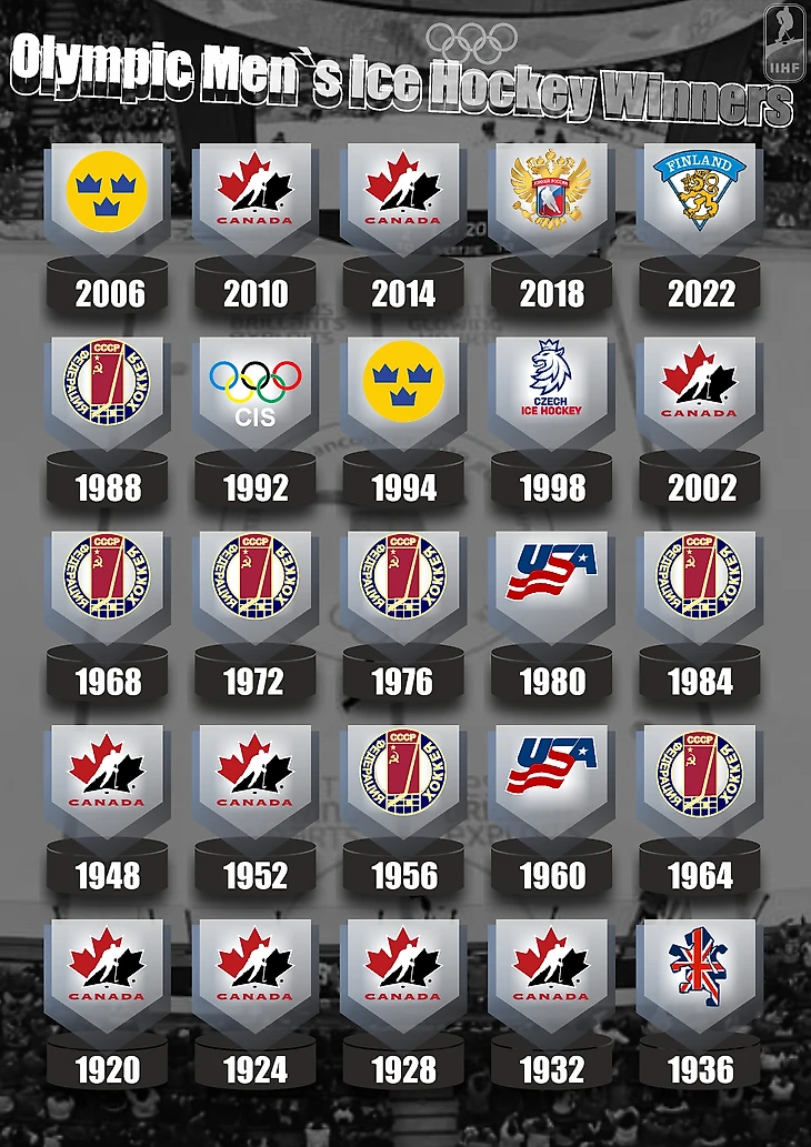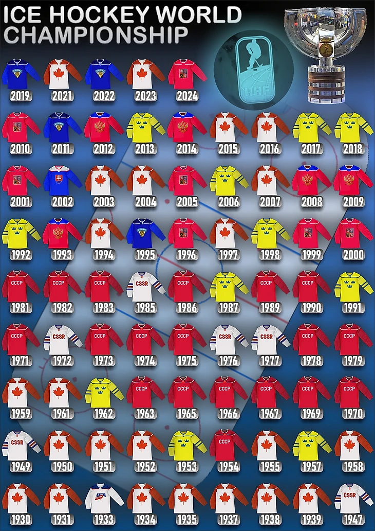 Хоккей с шайбой ‒ это быстрый, подвижный и захватывающий вид спорта, в котором участвуют две команды по шесть игроков на льду. Он собирает толпы зрителей благодаря драматизму и напряженности матчей. В этой подборке отражены победители и результаты значимых международных, клубных и национальных хоккейных турниров. В большинстве случаев эмблемы клубов представлены современными, однако есть и такие, которые изображены в историческом виде. Победители чемпионатов мира и Олимпийских игр указаны без повторений. Многие исчезнувшие команды и даже страны, обзавелись преемниками, иные же условно притянуты, для создания визуального и статистического соответствия.